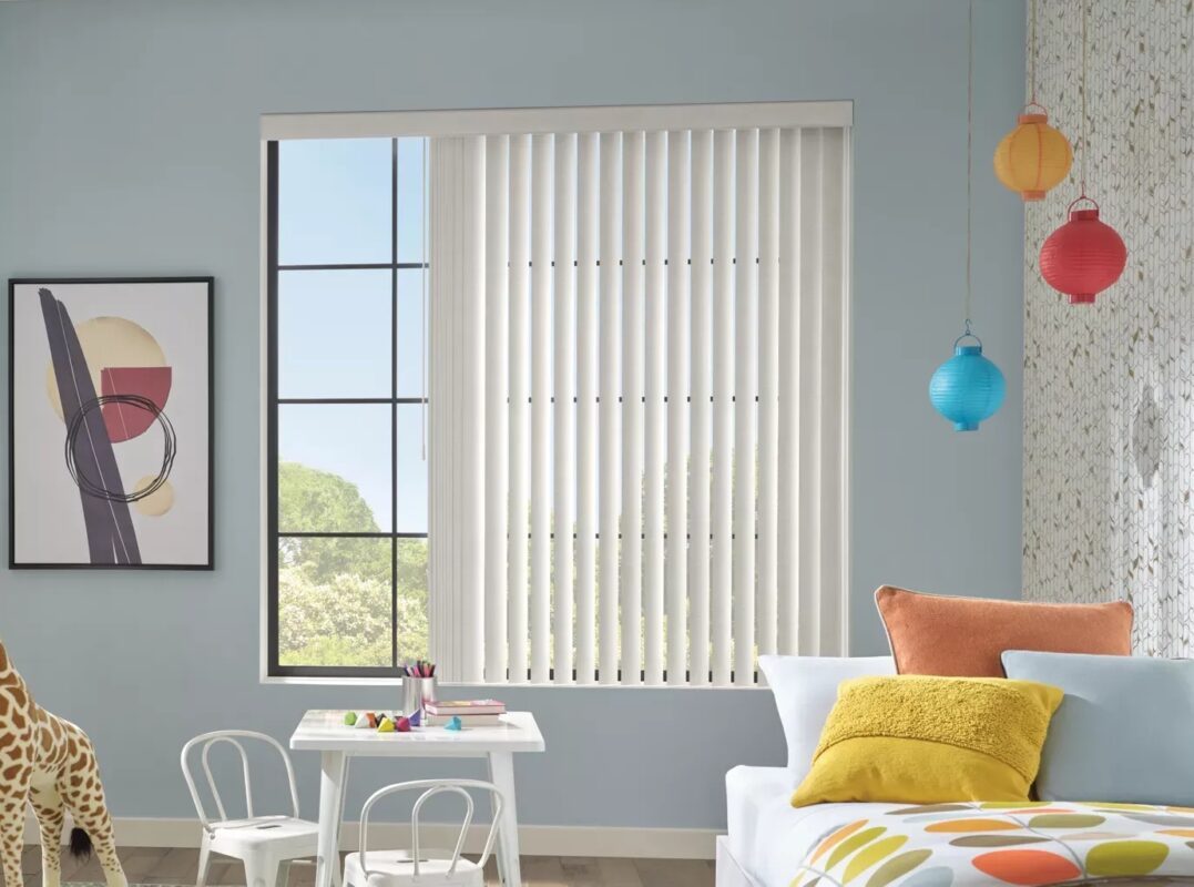 Light-diffusing vertical sheer panels with fully-integrated vertical vanes.