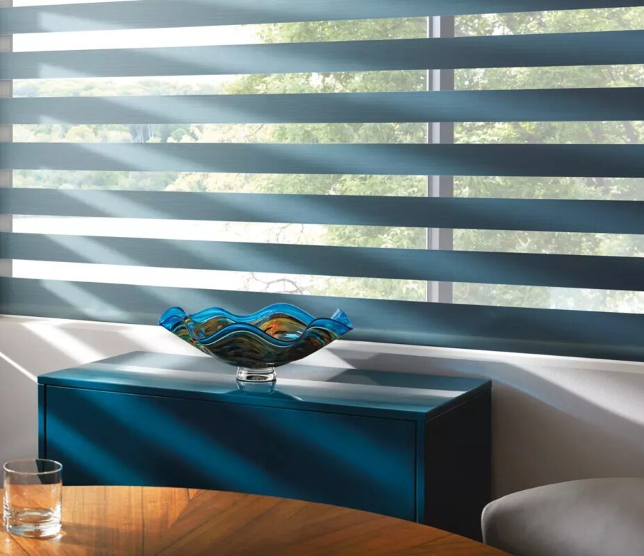 Adjustable, layered sheer and solid fabric bands, providing enhanced light and privacy control.